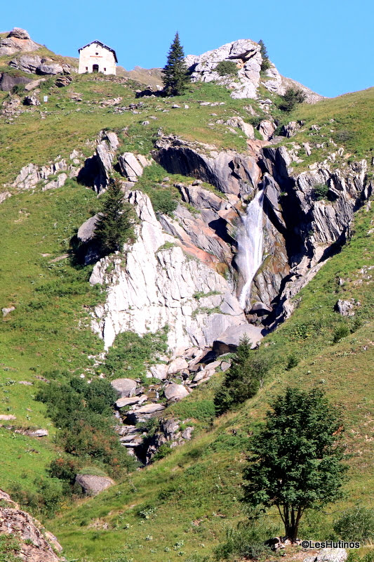 Nous poursuivons nos lacets de montagne qui arrivent petit à petit au Cormet d'Arèches, magnifique coin de montagne verdoyant. Première petite pause pour aller voir la chapelle St Guérin de Plan Pichu, le long du torrent alpin. Nous poursuivons la montée jusqu'au col, départ de nombreuses randonnées. En descendant, nouvelle halte vers le splendide Lac des Fées, d'une limpidité incroyable, perdu dans son écrin de verdure, alimenté par des torrents. Les enfants passeront un bon moment à jouer avec les canards et canetons du lac. S'en suit ensuite le barrage St Guerin, Arèches, puis la remontée vers le col des Prés, avant de redescendre sur le Barrage de Roselend, magnifique aussi, mais plus touristique, il est aussi bien plus peuplé. Nous trouverons tout de même une petite place pour manger à l'ombre du auvent, et descendrons au pied du lac. La roche est très coupante et abrasive, l'eau très claire aussi. Nous traversons le Cormet de Roselend puis descendons aux Chapieux, traversé par le torrent des Glaciers. Les enfants jouent un grand moment dans ce torrent... pas très chaud à faire des barrages de galets à en rendre jaloux les castors, et nous décidons d'y passer la nuit. Un suisse en combi se pose pas loin, le coin est relativement désert par rapport à la beauté du coin.... vu la météo qui s'annonce, pas très étonnant.
